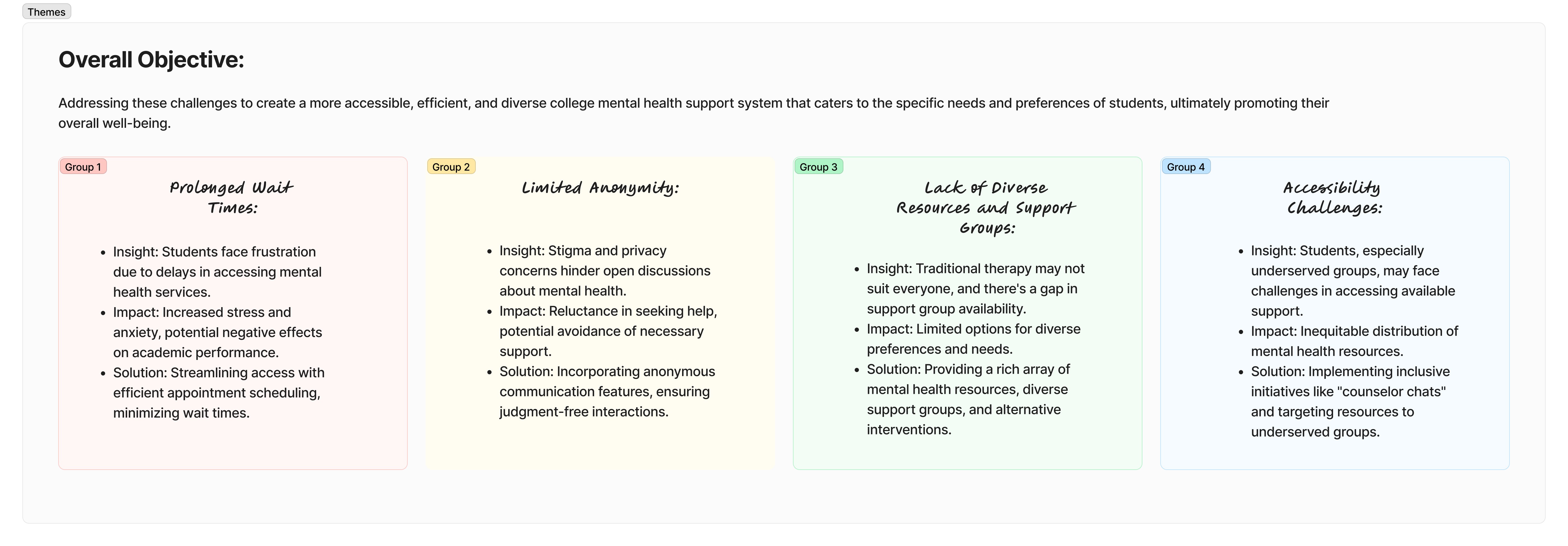 According to my affinity map, I believe that we are addressing challenges in the college/university mental health support system, including prolonged wait times, limited anonymity, a lack of diverse resources and support groups, to enhance overall accessibility and effectiveness for students seeking assistance.