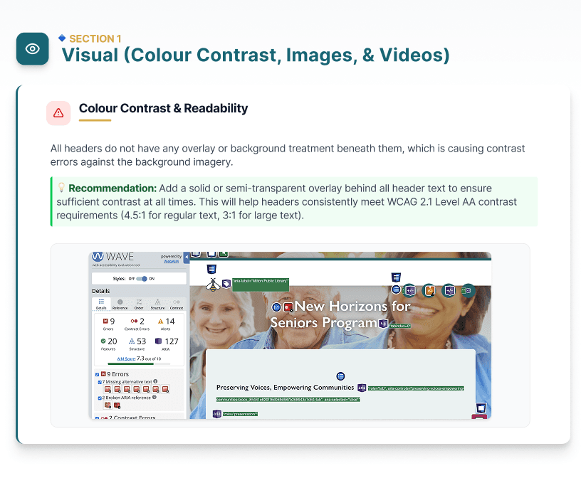 We found several accessibility gaps, including low contrast text, missing alt text, lack of keyboard navigation support, and unclear button labeling. Structural issues like missing “skip to content” links and incomplete ARIA labels made navigation more difficult for assistive technology users.