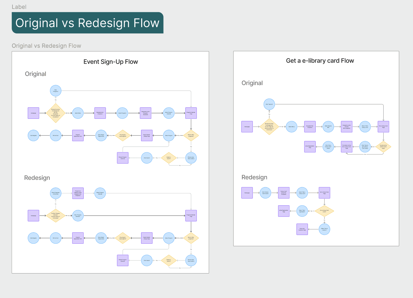 We identified key usability issues such as mismatched labels (e.g., “Sign Up” vs. “Get a Library Card”), unclear primary actions, and inconsistent terminology. Content was often duplicated or overly dense, making it harder for users to quickly find and understand key services.